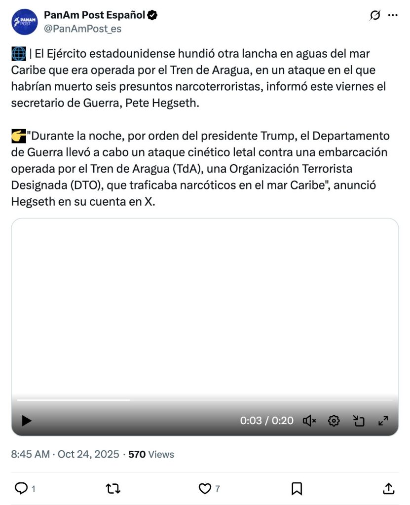 | El Ejército estadounidense hundió otra lancha en aguas del mar Caribe que era operada por el Tren de Aragua, en un ataque en el que habrían muerto seis presuntos narcoterroristas, informó este viernes el secretario de Guerra, Pete Hegseth.