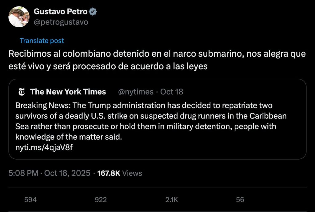 We welcomed the Colombian detained in the narco submarine. We are glad he is alive and will be prosecuted according to the law.