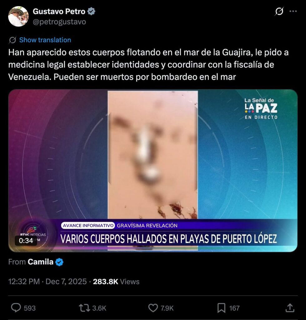 Han aparecido estos cuerpos flotando en el mar de la Guajira, le pido a medicina legal establecer identidades y coordinar con la fiscalĂa de Venezuela. Pueden ser muertos por bombardeo en el mar