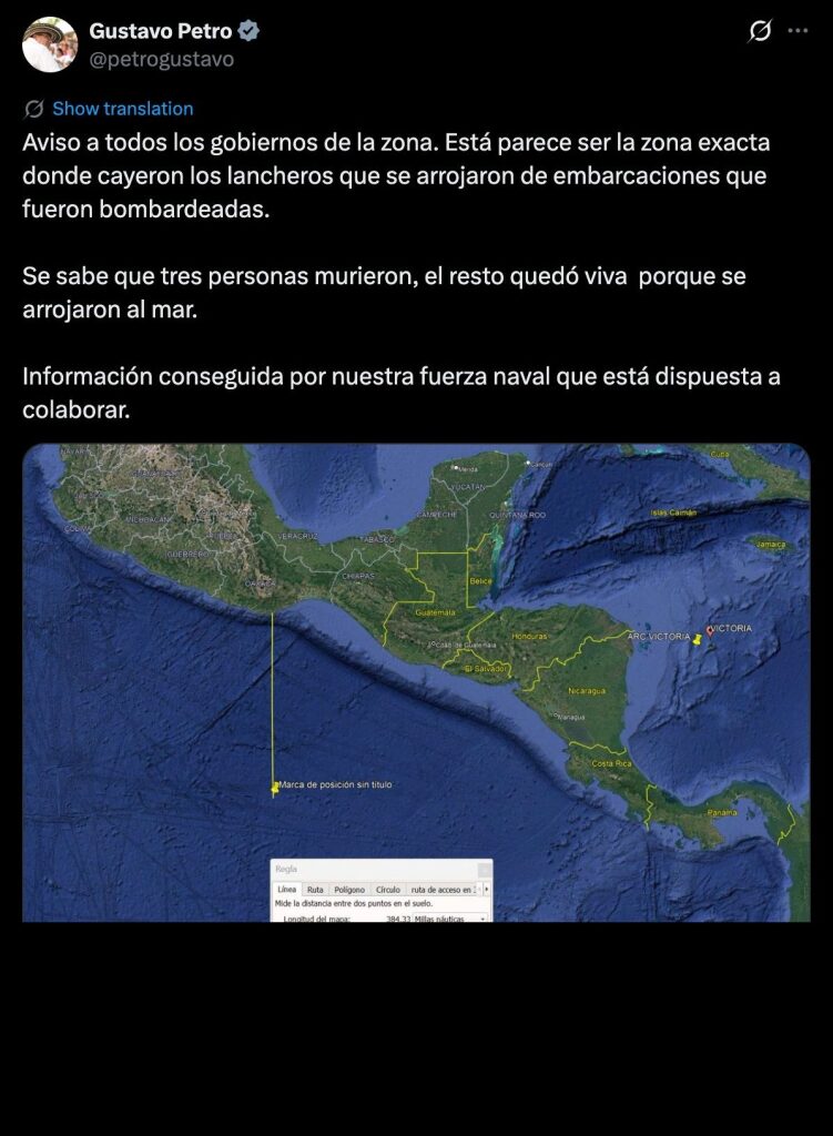 Aviso a todos los gobiernos de la zona. Está parece ser la zona exacta donde cayeron los lancheros que se arrojaron de embarcaciones que fueron bombardeadas.