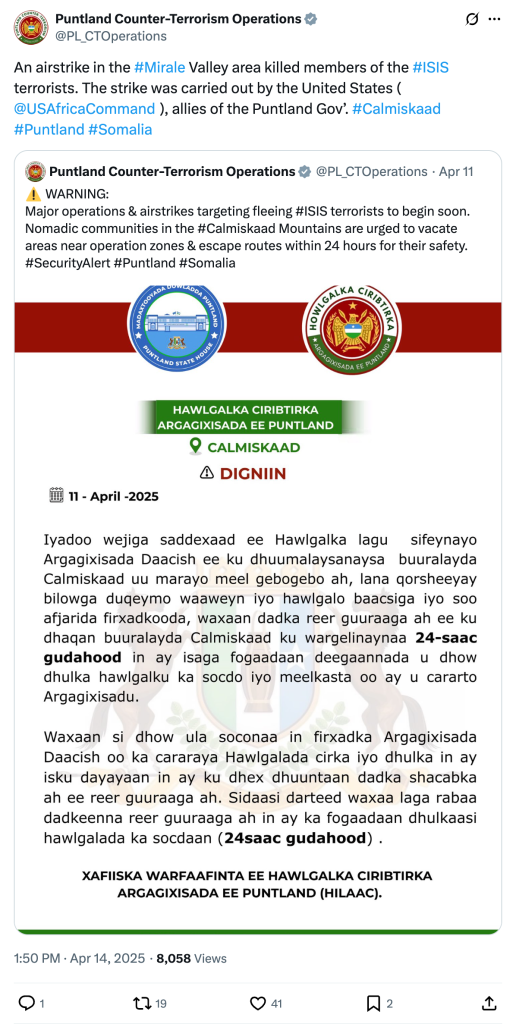 An airstrike in the #Mirale Valley area killed members of the #ISIS terrorists. The strike was carried out by the United States (@USAfricaCommand ), allies of the Puntland Gov’. #Calmiskaad #Puntland #Somalia
