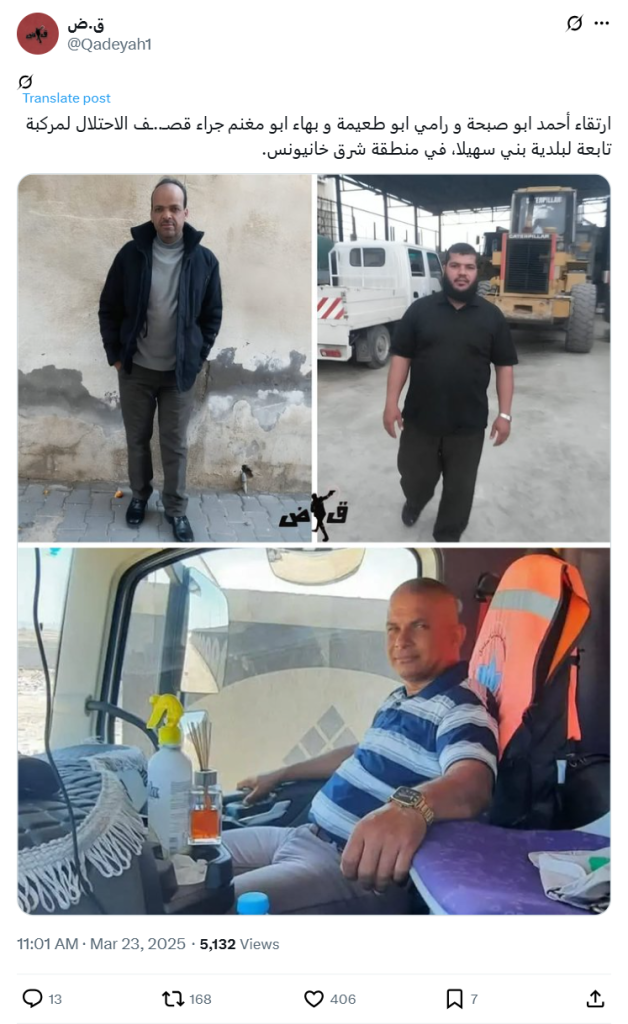 Ahmed Abu Subha, Rami Abu Ta'ima, and Baha' Abu Mughnim were killed as a result of the occupation's shelling of a vehicle belonging to the Bani Suhaila Municipality, in the eastern Khan Yunis area.