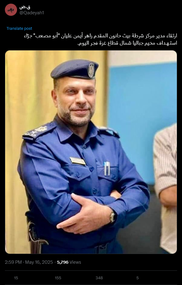 ارتقاء مدير مركز شرطة بيت حانون المقدم زاهر أيمن عليان "أبو مصعب" جرّاء استـهـداف مخيم جباليا شمال قطاع غزة فجر اليوم.
