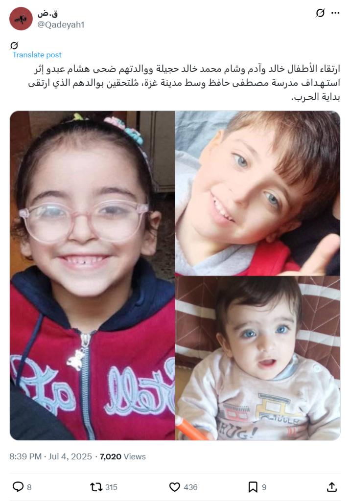 ارتقاء الأطفال خالد وآدم وشام محمد خالد حجيلة ووالدتهم ضحى هشام عبدو إثر استـهـداف مدرسة مصطفى حافظ وسط مدينة غزة، مُلتحقين بوالدهم الذي ارتقى بداية الحـرب.