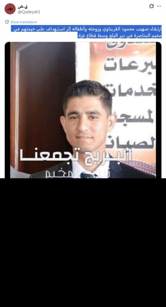 Suhaib Mahmoud Al-Qarnawi, his wife and children were killed when their tent in the Al-Manasra camp in Deir al-Balah in the central Gaza Strip was targeted.