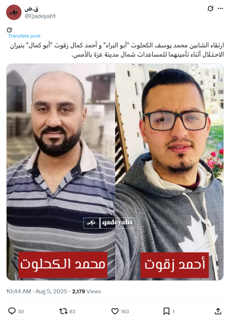 The two young men, Mohammed Yousef Al-Kahlout "Abu Al-Baraa" and Ahmed Kamal Zaqout "Abu Kamal", were killed by the occupation forces' fire while securing aid north of Gaza City yesterday.