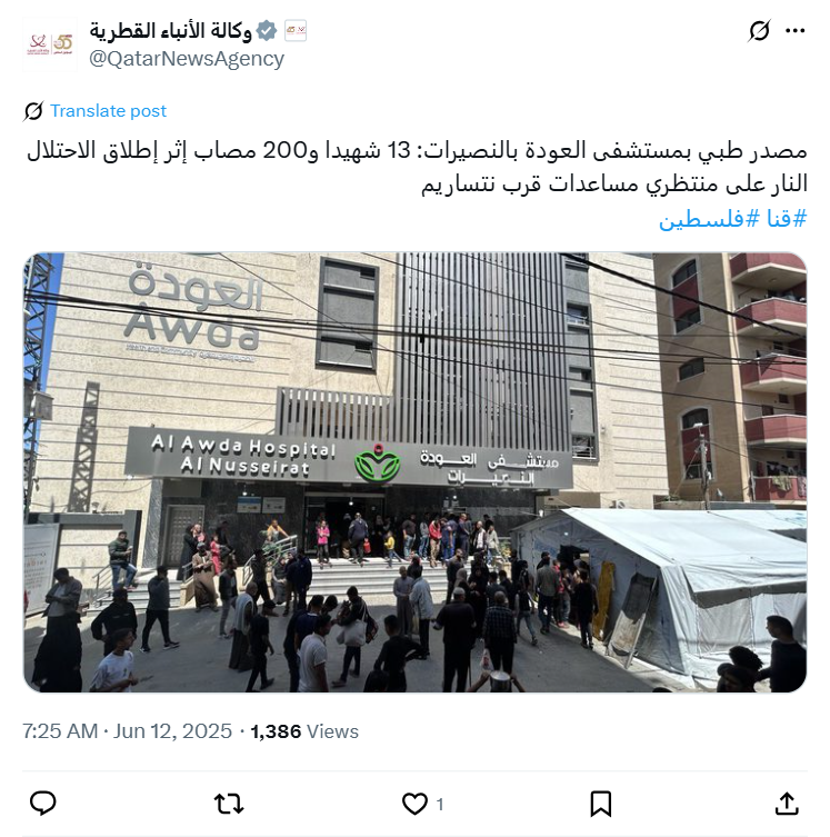 A medical source at Al-Awda Hospital in Nuseirat: 13 martyrs and 200 wounded after the occupation forces opened fire on people waiting for aid near Netzarim. #QNA #Palestine