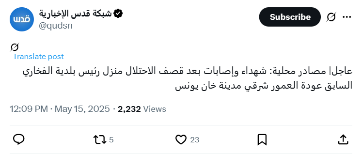 Urgent | Local sources: Martyrs and injuries after the occupation forces bombed the home of former Al-Fakhari mayor, Awda Al-Amour, east of Khan Yunis.