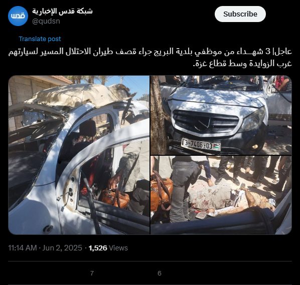 عاجل| 3 شهــــداء من موظفي بلدية البريج جراء قصف طيران الاحتلال المسير لسيارتهم غرب الزوايدة وسط قطاع غزة.