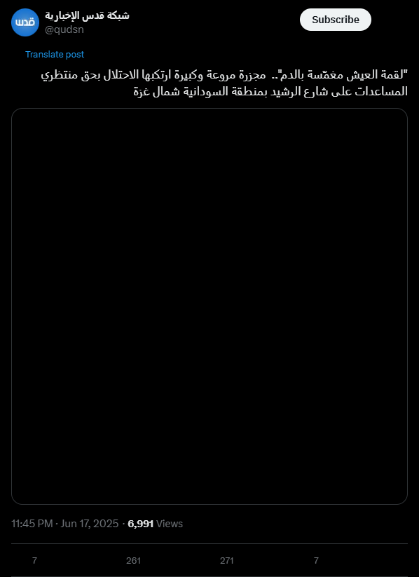 "A livelihood drenched in blood." A horrific and massive massacre committed by the occupation against those waiting for aid on Rashid Street in the Sudanese area, north of Gaza.