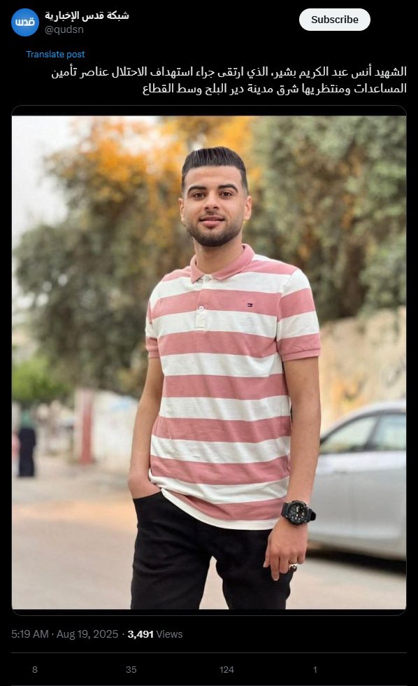 الشهيد أنس عبد الكريم بشير، الذي ارتقى جراء استهداف الاحتلال عناصر تأمين المساعدات ومنتظريها شرق مدينة دير البلح وسط القطاع