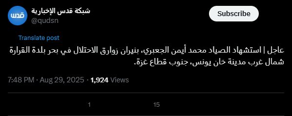 Urgent | Fisherman Mohammed Ayman al-Ja'bari was killed by Israeli gunfire off the coast of al-Qarara town, northwest of Khan Yunis, in the southern Gaza Strip.