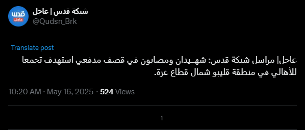 Urgent | Quds Network correspondent: Two martyrs and several wounded in artillery shelling targeting a gathering of civilians in the Qalibo area, north of the Gaza Strip.