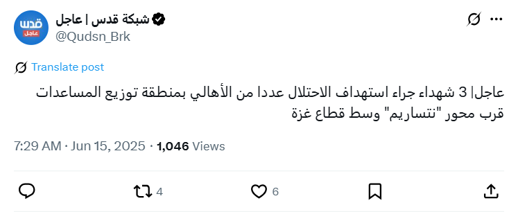 Urgent | 3 martyrs as a result of the occupation targeting a number of residents in the aid distribution area near the Netzarim axis in the central Gaza Strip.