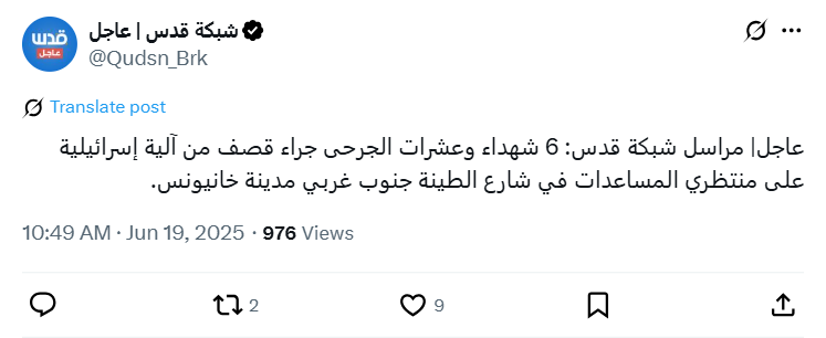 Urgent | Quds Network correspondent: 6 martyrs and dozens wounded as a result of an Israeli tank shelling targeting people waiting for aid on al-Tina Street, southwest of Khan Yunis.
