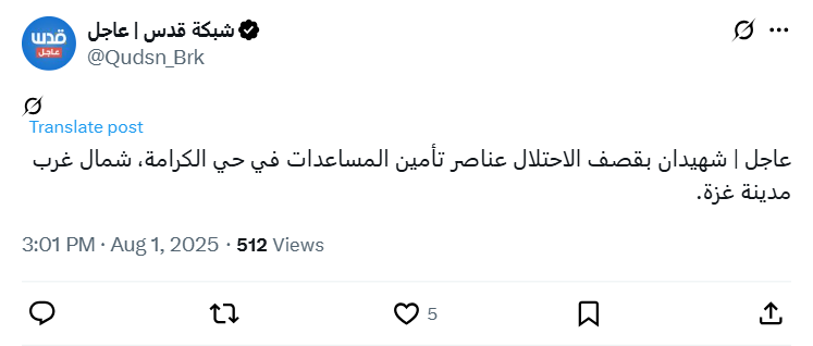 Urgent | Two martyrs in Israeli bombing of aid workers in Al-Karama neighborhood, northwest of Gaza City.
