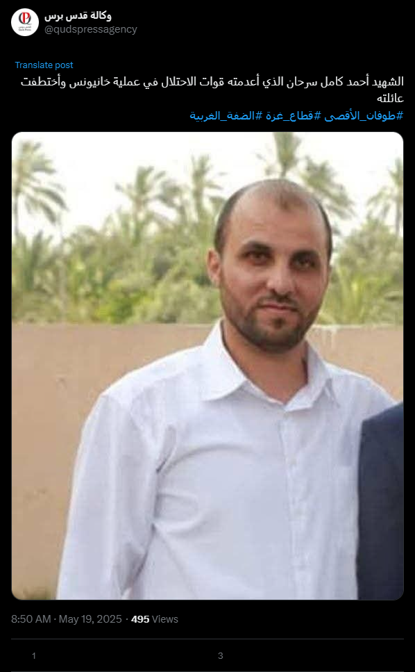 Martyr Ahmed Kamel Sarhan, who was executed by the occupation forces in the Khan Yunis operation and whose family was kidnapped. #AlAqsa_Flood #Gaza_Strip #West_Bank