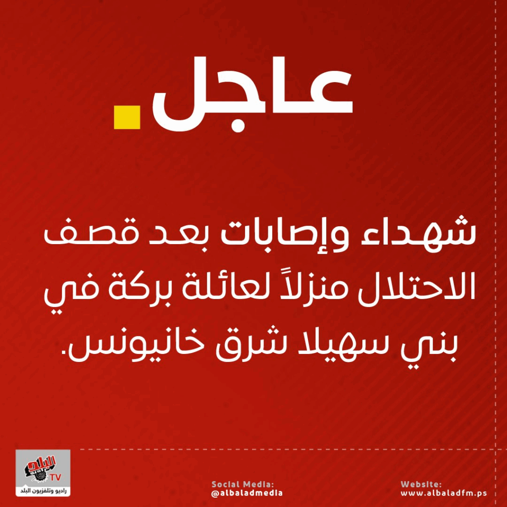 Martyrs and injuries after the occupation forces bombed the home of the Baraka family in Bani Suhaila, east of Khan Yunis.