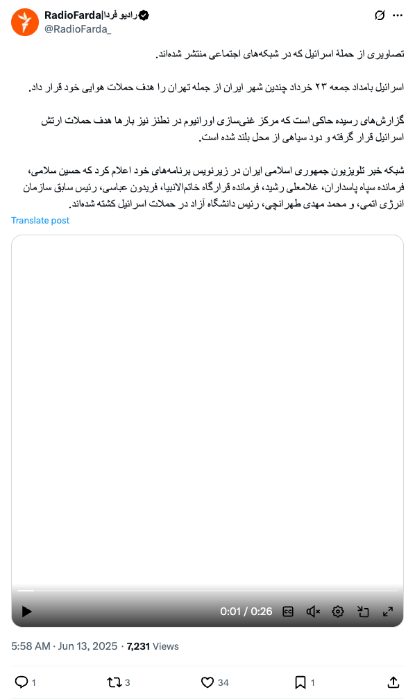 شبکه خبر تلویزیون جمهوری اسلامی ایران در زیرنویس برنامههای خود اعلام کرد که حسین سلامی، فرمانده سپاه پاسداران، غلامعلی رشید، فرمانده قرارگاه خاتمالانبیا، فریدون عباسی، رئیس سابق سازمان انرژی اتمی، و محمد مهدی طهرانچی، رئیس دانشگاه آزاد در حملات اسرائیل کشته شدهاند.