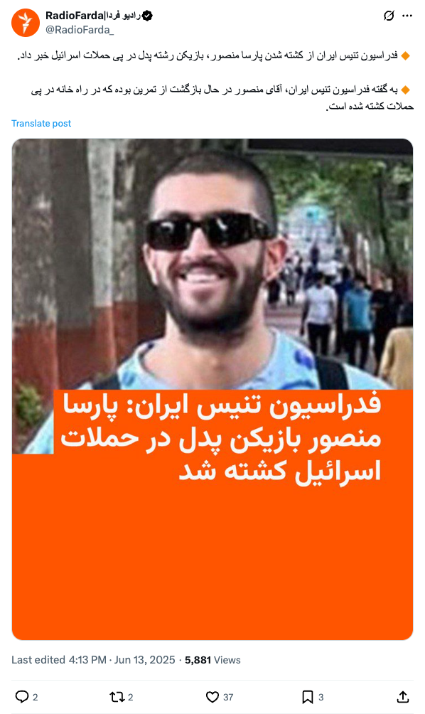 The Iranian Tennis Federation announced the death of padel player Parsa Mansour following Israeli attacks. According to the Iranian Tennis Federation, Mr. Mansour was returning from training when he was killed on his way home following the attacks.