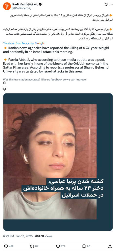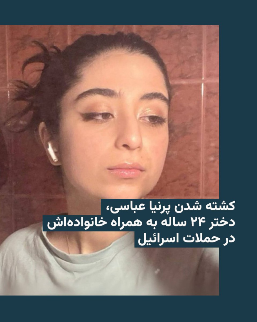 Iranian news agencies reported the killing of a 24-year-old girl and her family in an Israeli attack this morning. Parnia Abbasi, who the media said was a poet, lived with her family in one of the blocks of the Orkideh complex in the Sattarkhan area. According to reports, a professor at Shahid Beheshti University was targeted in the Israeli attacks in the area.
