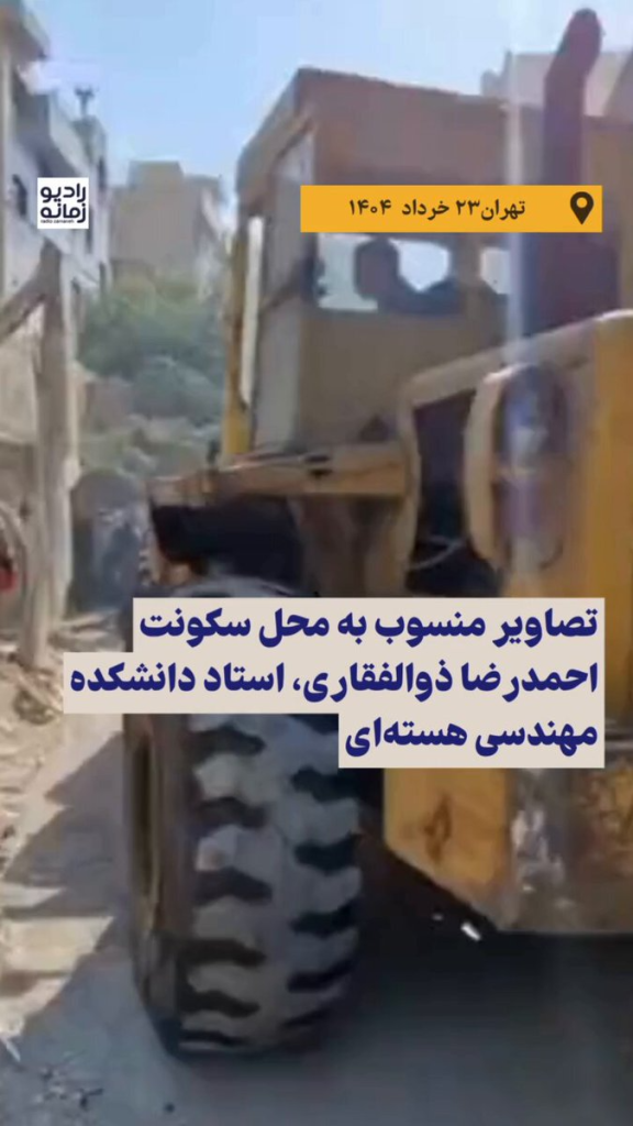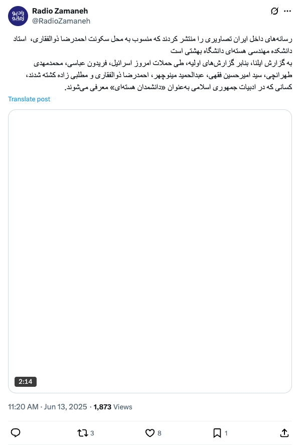 Iranian media outlets published images attributed to the residence of Ahmad Reza Zolfaghari, a professor at the Faculty of Nuclear Engineering at Beheshti University. According to ILNA, according to initial reports, during today's Israeli attacks, Fereydoun Abbasi, Mohammad Mehdi Tehranchi, Seyyed Amir Hossein Faqhi, Abdolhamid Minouchehr, Ahmad Reza Zolfaghari, and Motabli Zadeh were killed, who are introduced as "nuclear scientists" in the literature of the Islamic Republic.