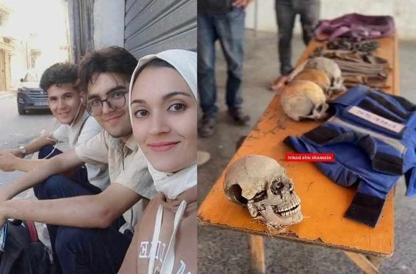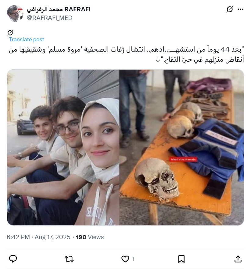 "44 days after their martyrdom... the remains of journalist Marwa Muslim and her two brothers were recovered from the rubble of their home in the Tuffah neighborhood."↓
