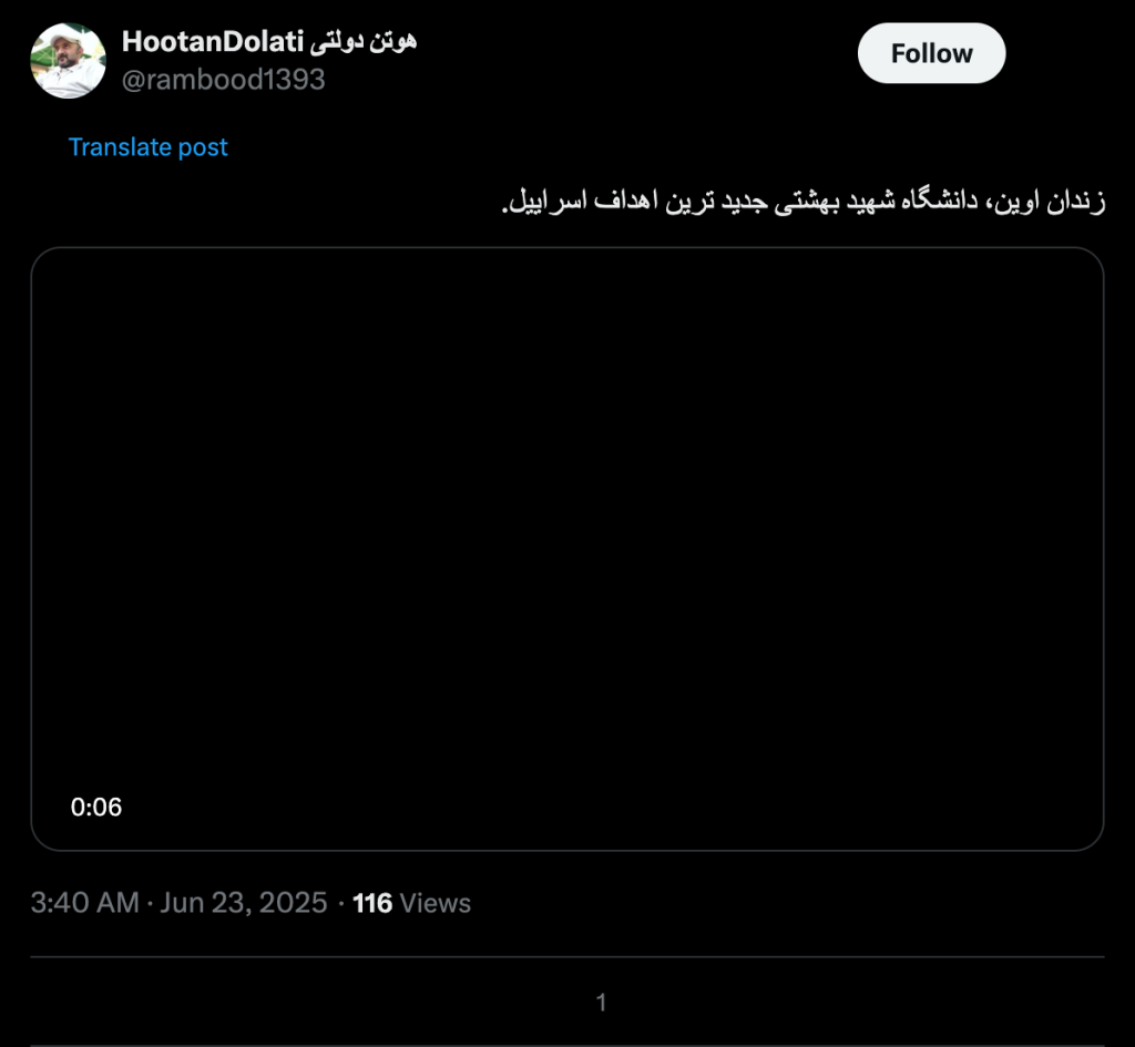 زندان اوین، دانشگاه شهید بهشتی جدید ترین اهداف اسراییل.