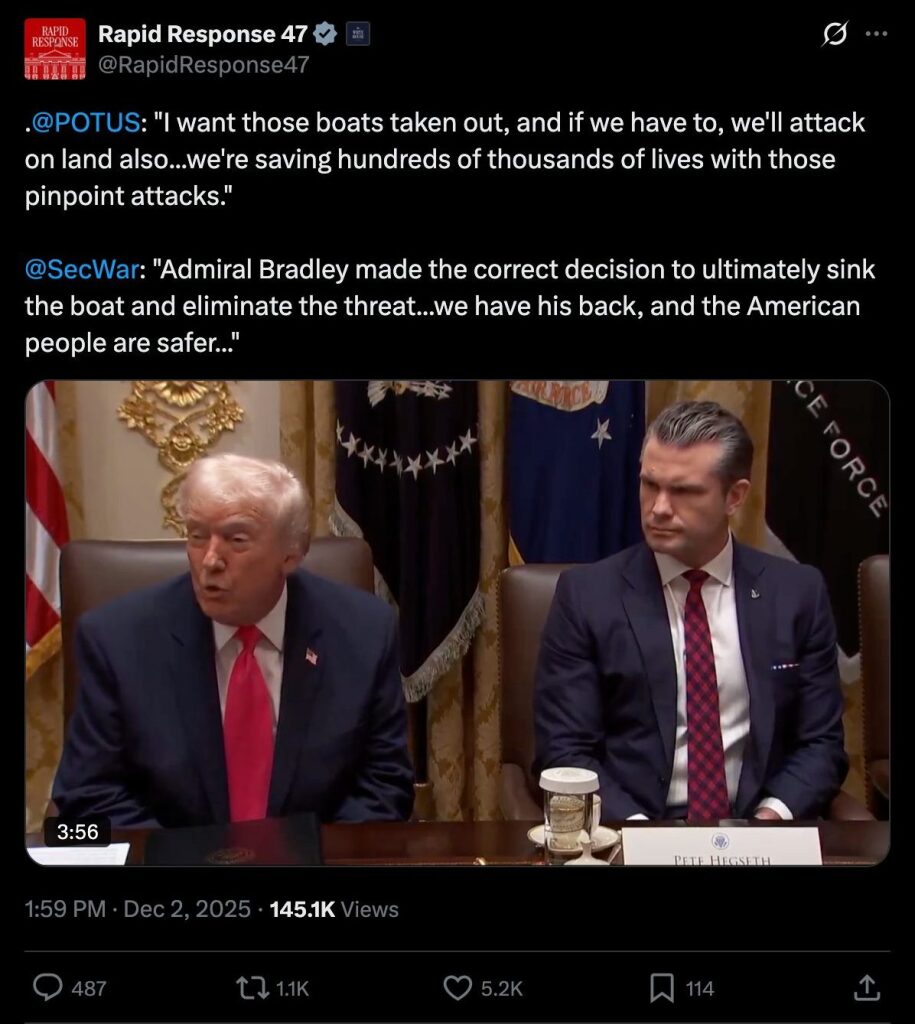 @SecWar: "Admiral Bradley made the correct decision to ultimately sink the boat and eliminate the threat...we have his back, and the American people are safer..."