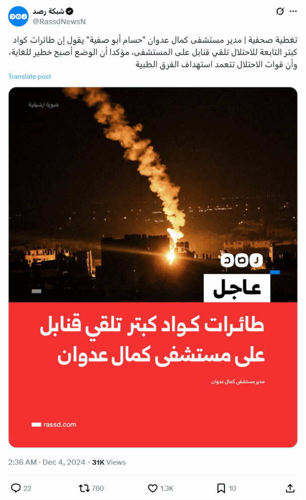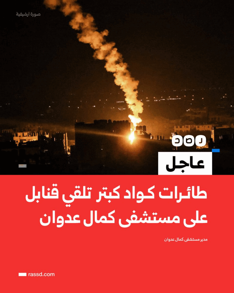 Press Coverage | Director of Kamal Adwan Hospital, Hussam Abu Safia, says that Israeli quadcopters are dropping bombs on the hospital, stressing that the situation has become extremely dangerous, and that the occupation forces are deliberately targeting medical teams.