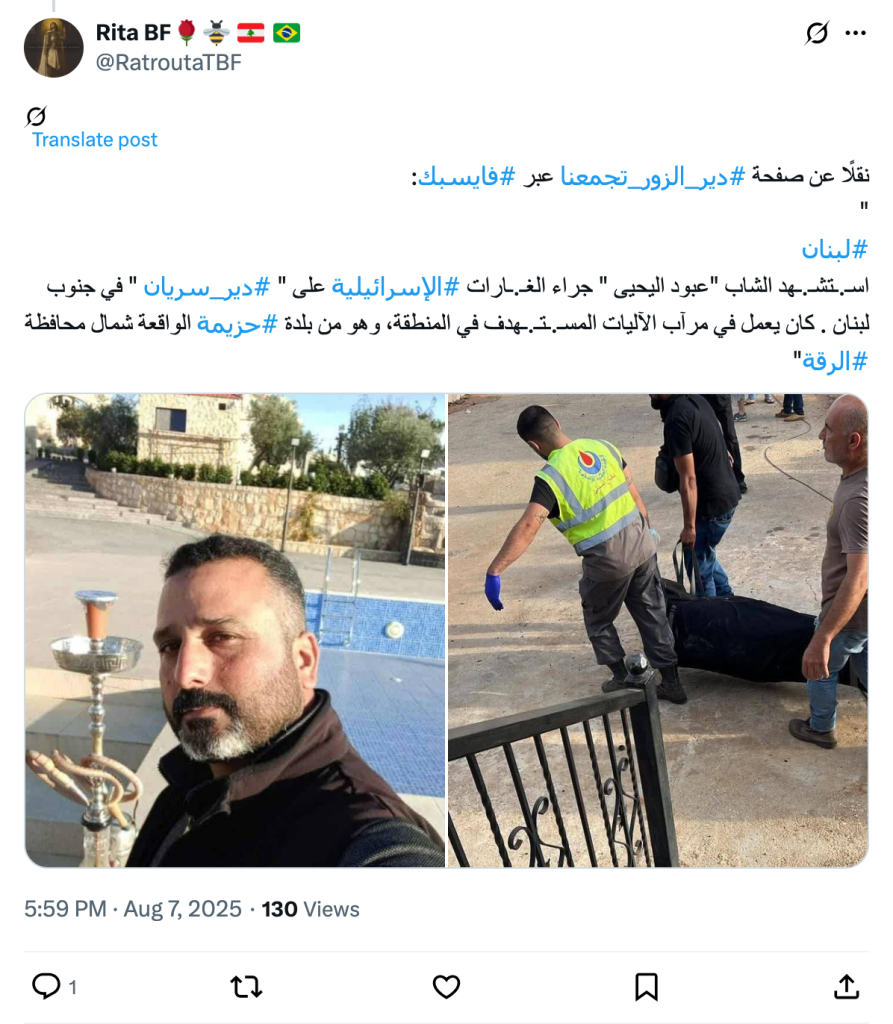 The young man "Aboud Al-Yahya" was martyred as a result of the #Israeli raids on "#Deir_Saryan" in southern Lebanon. He was working in the targeted machinery garage in the area. He is from the town of #Hazima, located north of #Raqqa Governorate."