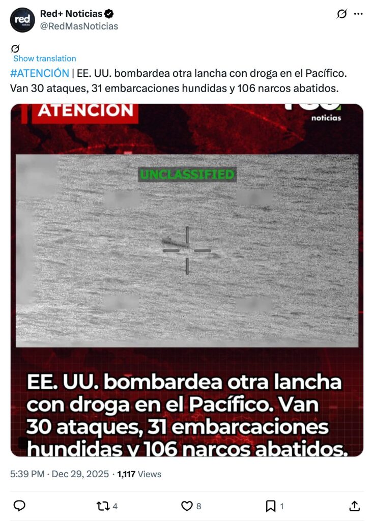 #ATENCIÓN | EE. UU. bombardea otra lancha con droga en el Pacífico. Van 30 ataques, 31 embarcaciones hundidas y 106 narcos abatidos.