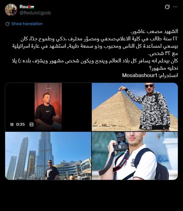 A 22-year-old media student, journalist, and professional photographer, he was very intelligent and ambitious. He always sought to help everyone and was well-liked and respected. He was martyred in an Israeli airstrike along with 32 others.