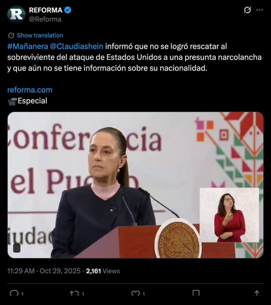 In her morning press conference, Claudia Sheinbaum reported that the survivor of the U.S. attack on a suspected drug-trafficking boat was not rescued and that his nationality is still unknown.