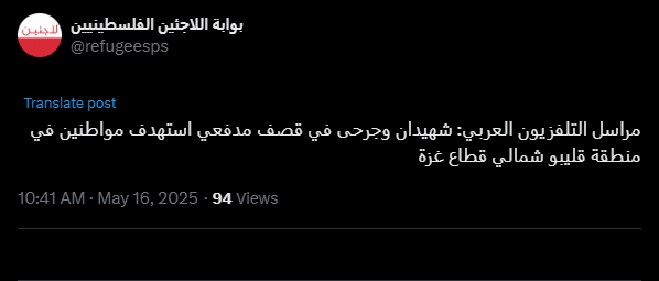 مراسل التلفزيون العربي: شهيدان وجرحى في قصف مدفعي استهدف مواطنين في منطقة قليبو شمالي قطاع غزة