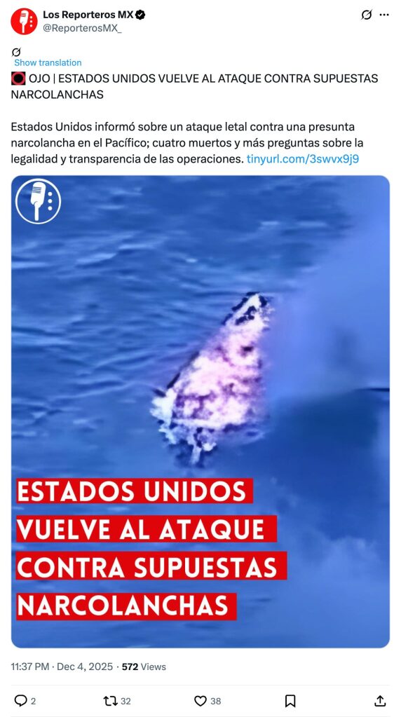 The United States reported a deadly attack against an alleged drug boat in the Pacific; four dead and more questions about the legality and transparency of the operations. https://tinyurl.com/3swvx9j9