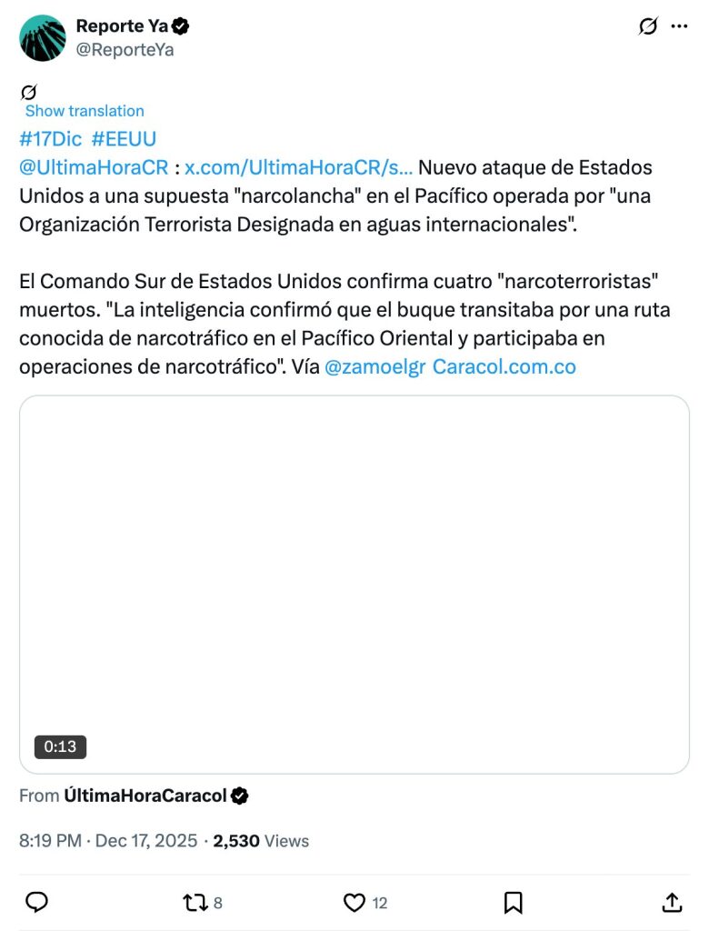 @UltimaHoraCR : https://x.com/UltimaHoraCR/status/2001472122414043267/video/1… Nuevo ataque de Estados Unidos a una supuesta "narcolancha" en el Pacífico operada por "una Organización Terrorista Designada en aguas internacionales".