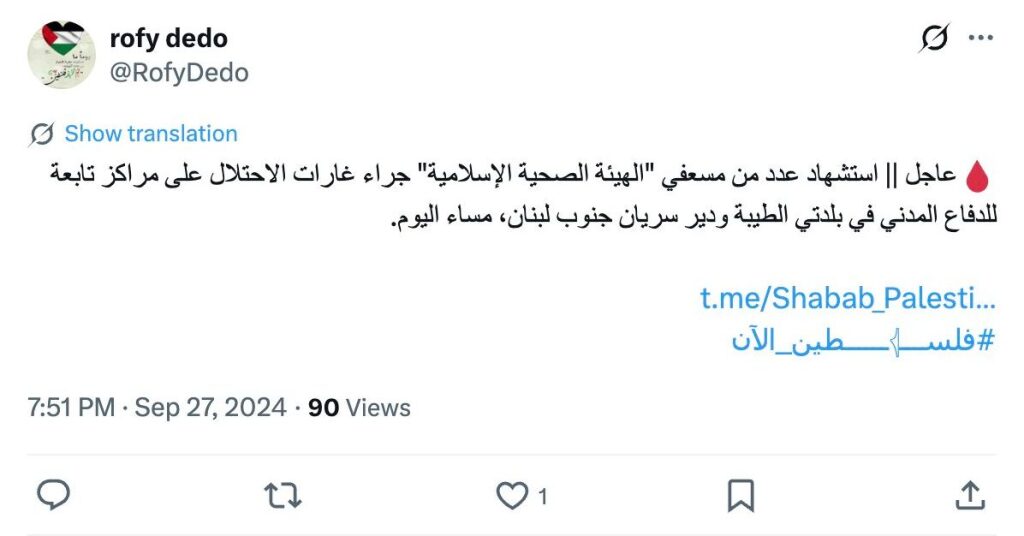 Urgent || Several paramedics from the Islamic Health Authority were martyred this evening as a result of Israeli airstrikes targeting Civil Defense centers in the towns of Taybeh and Deir Siryan in southern Lebanon.