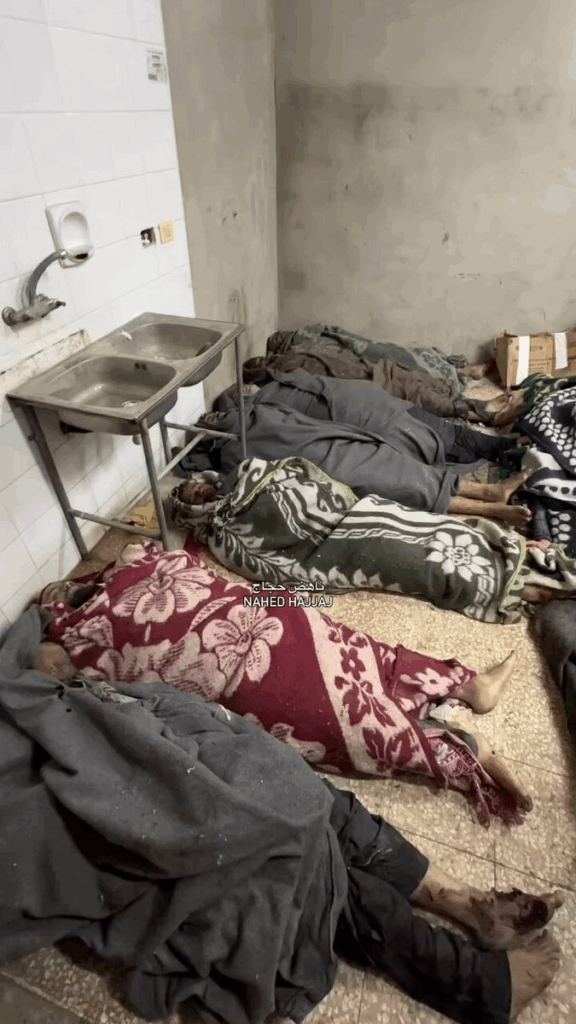 The bodies of the martyrs who were killed in the occupation's massacre after bombing a mosque crowded with displaced people in front of Al-Aqsa Martyrs Hospital in the central Gaza Strip. The occupation bombed Ibn Rushd School, which houses displaced people in Al-Zawaida in the central Gaza Strip.