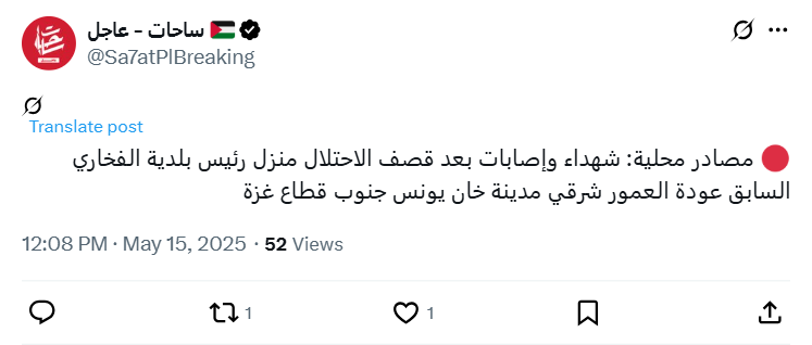 Local sources: Martyrs and injuries after the occupation forces bombed the home of former Al-Fakhari mayor, Awda Al-Amour, east of Khan Yunis, in the southern Gaza Strip.