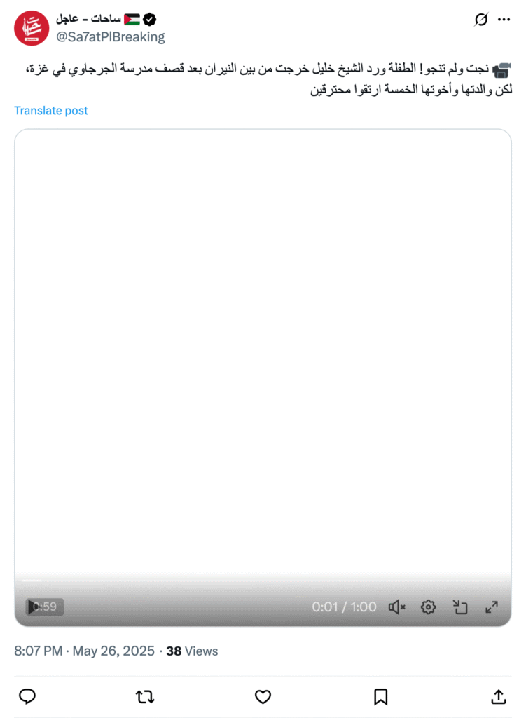 نجت ولم تنجو! الطفلة ورد الشيخ خليل خرجت من بين النيران بعد قصف مدرسة الجرجاوي في غزة، لكن والدتها وأخوتها الخمسة ارتقوا محترقين