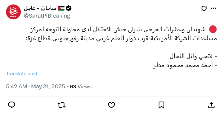 Two martyrs and dozens wounded by Israeli army fire while trying to head to the American company's aid center near Al-Alam roundabout west of Rafah city in the southern Gaza Strip: - Fathi Wael Al-Nahhal - Ahmed Muhammad Mahmoud Matar