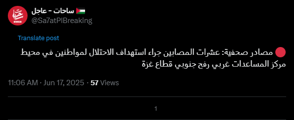 مصادر صحفية: عشرات المصابين جراء استهداف الاحتلال لمواطنين في محيط مركز المساعدات غربي رفح جنوبي قطاع غزة