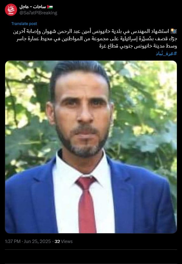 Khan Yunis Municipality engineer Amin Abdul Rahman Shahwan was killed and others were injured in an Israeli drone strike on a group of civilians near the Jasser Building in the center of Khan Yunis, south of the Gaza Strip. #Gaza_is_being_annihilated.