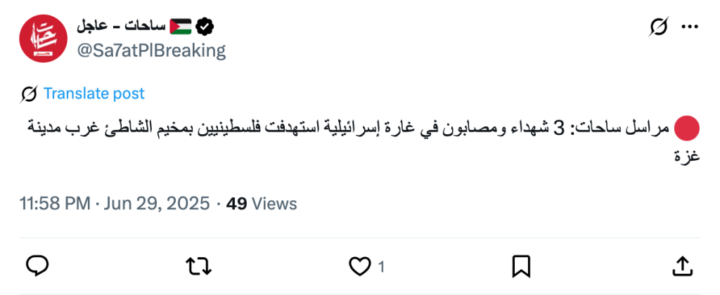 Sahat correspondent: 3 martyrs and wounded in an Israeli raid targeting Palestinians in the Al-Shati refugee camp, west of Gaza City.