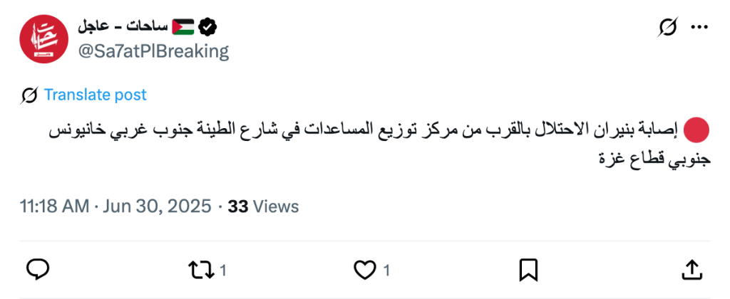 An injury was caused by Israeli occupation fire near an aid distribution center on al-Tina Street, southwest of Khan Yunis, in the southern Gaza Strip.