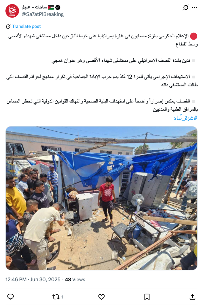 Government media in Gaza: Injured in an Israeli raid on a tent for displaced people inside Al-Aqsa Martyrs Hospital in the central Gaza Strip. We strongly condemn the Israeli bombing of Al-Aqsa Martyrs Hospital. It is a barbaric aggression. This criminal targeting occurs for the 12th time since the beginning of the war of genocide, in a systematic repetition of the bombing crimes that targeted the same hospital. The bombing reflects a clear insistence on targeting the health infrastructure and violating international laws that prohibit harming medical facilities and civilians. #Gaza_is_being_annihilated