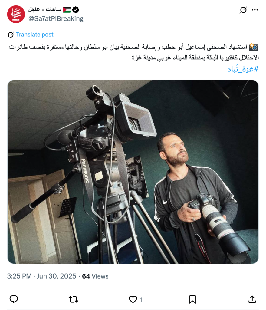 Journalist Ismail Abu Hatab was martyred and journalist Bayan Abu Sultan was injured and her condition is stable, as a result of the occupation forces’ bombing of Al-Baqa Cafeteria in the Mina area, west of Gaza City. #Gaza_is_being_annihilated.