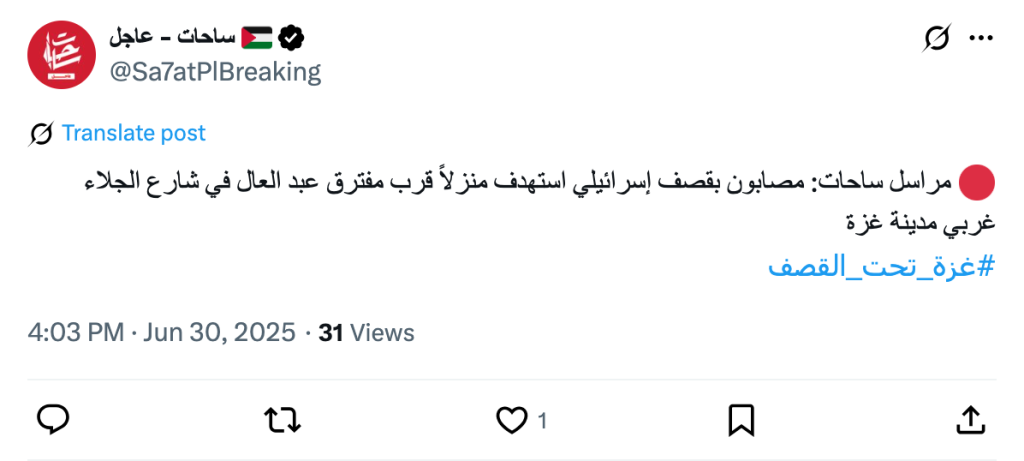 مراسل ساحات: مصابون بقصف إسرائيلي استهدف منزلاً قرب مفترق عبد العال في شارع الجلاء غربي مدينة غزة