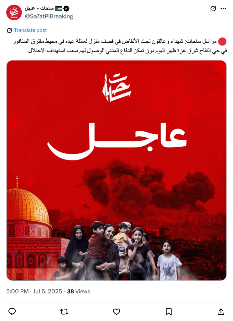 مراسل ساحات: شهداء وعالقون تحت الأنقاض في قصف منزل لعائلة عبده في محيط مفترق السنافور في حي التفاح شرق غزة ظهر اليوم دون تمكن الدفاع المدني الوصول لهم بسبب استهداف الاحتلال